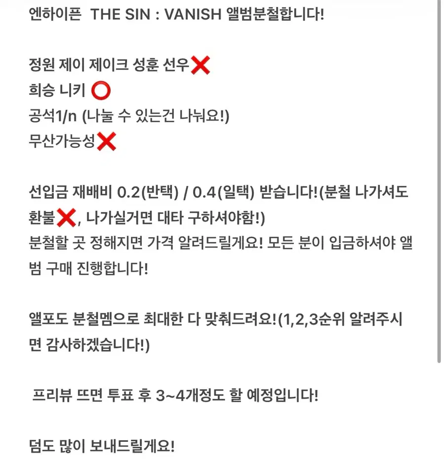 분철할 곳 정해지면 가격 알려드릴게요! 모든 분이 입금하셔야 앨범 구매 진행합니다!