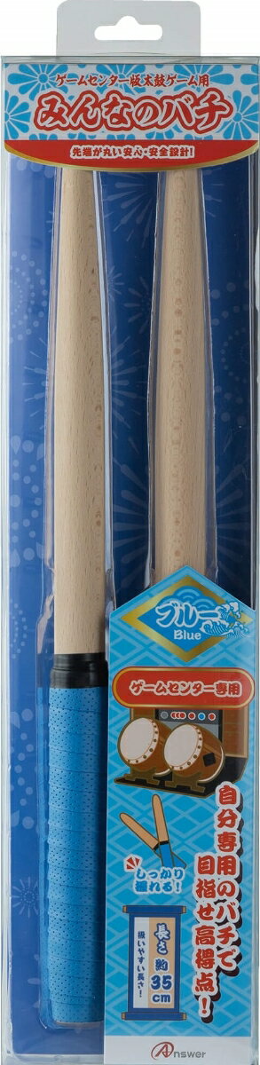 【マイバチで目指せ高得点!】●素材:メイプル  長さ:約35cm  太さ:約2cm(最大)  質量:1本あたり約75g  ●ゲームセンター版の太鼓ゲームに合わせたバチ!ゲームセンター版の太鼓ゲームに合わせたバチで、老若男女にお使いやすいバチで、自分専用のバチとしてもお使いいただけます。 ●グリップ部分には滑り止め加工!グリップ部分は滑り止め加工を施しており、握りやすくなりバチにも力が伝わりやすくなります。●先端が丸い安心設計!バチの先端を丸くすることにより折れにくく、太鼓を傷つけにくくなっております。お子様にも安心してお使いいただけます。 ●2色カラー!カラーはブルーとピンクの2色をご用意!お気に入りのカラーでゲームプレイをお楽しみいただけます。●超軽量で遊びやすい!1本あたりわずか約75gと超軽量で、プレイ中も疲れにくい。