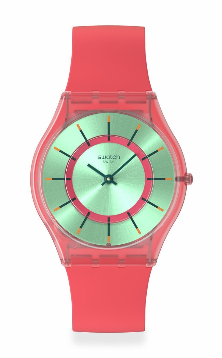 超薄型で、サンレイ仕上げのターコイズの文字盤にダークピンクプリントが施された内側のリング、ダークグリーンとオレンジのツートーンのアワーマーカー、ダークグリーンの時針と分針を備え、すべてバイオ由来素材グラスで覆われています。