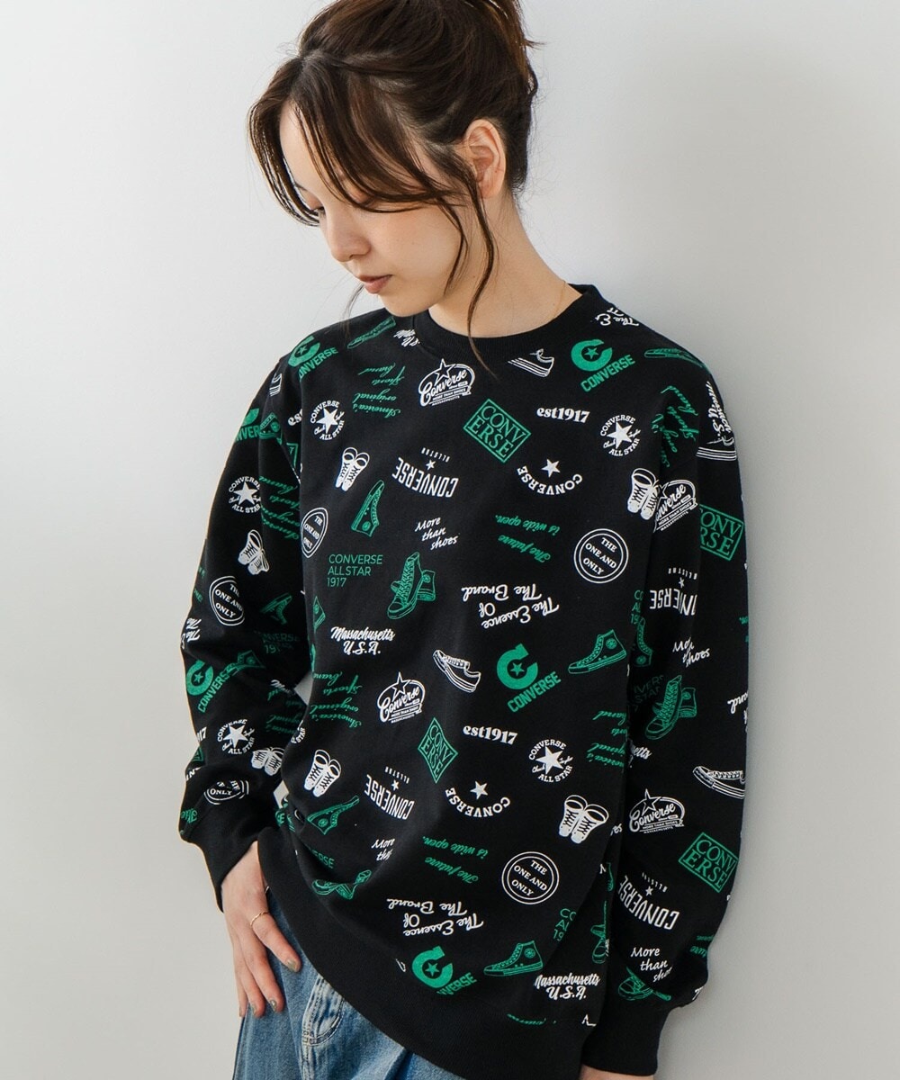 全身にちりばめられたCONVERSEのアイコンロゴやシューズの総柄プリントが遊び心と存在感をプラス!