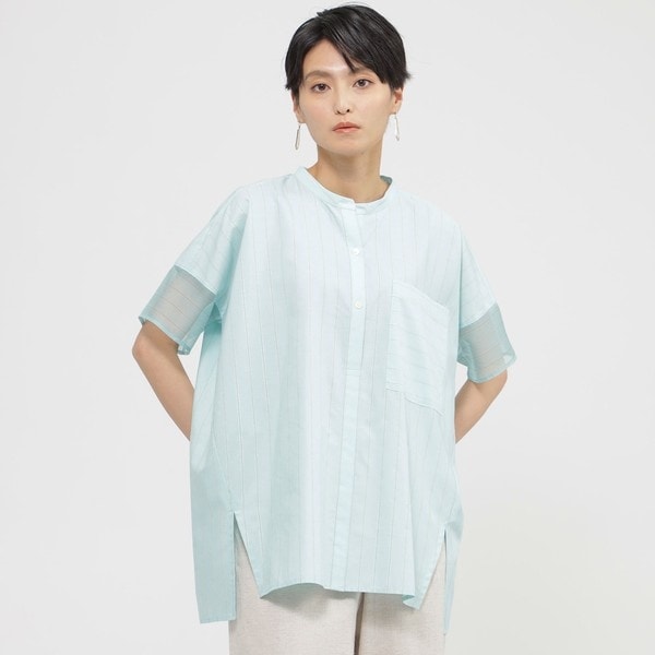 バンドカラーのフレンチスリーブブラウス。程よくゆとりのあるシルエットで体型カバーも叶います。