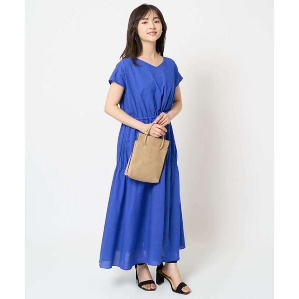 ウエストのリボンでシルエットの調節が可能なワンピース。肩の傾斜に沿った長めのフレンチスリーブで、デコルテから二の腕までをすっきりとカバーできるデザインに仕上げました。