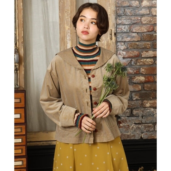 配色コーデュロイでお仕立てしたブラウス。テーマの「帝国通り」からインスピレーションを受けています。ジャケットライクにも着用できるゆったりシルエット。季節の変わり目のライトアウターとしても着用可能です。襟元はセーラーカラーで大人可愛いひと品に。丸みのあるフロントポケットや配色ボタンなど細部のディテールにも注目です。レトロな雰囲気が楽しめるブラウスは今季イチオシのオススメアイテムです。