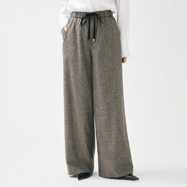 ウールサキソニーのワイドパンツは、柔らかく滑らかな手触で洗練された印象を与えます。