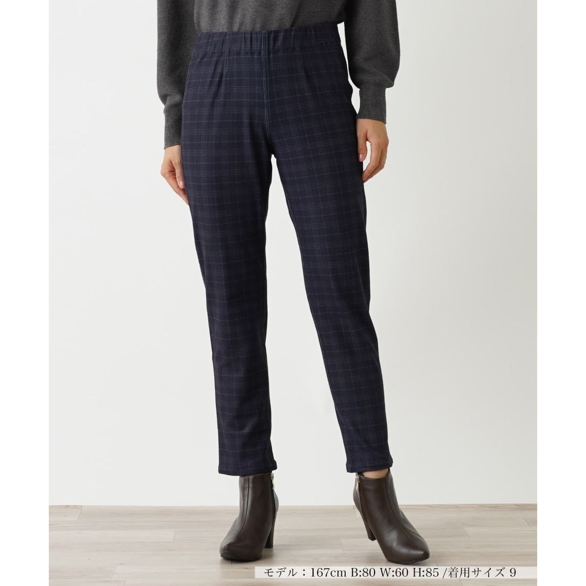 気分やスタイルに応じて、タータンチェックと千鳥格子柄を両面で楽しめるリバーシブル仕様のテーパードトラウザーズ。表側はクラシカルなタータンチェックでカジュアルな印象に、裏側はエレガントな千鳥格子で洗練された雰囲気を演出。腿周りにはゆとりを持たせ、動きやすさを確保しながら、裾に向かってすっきりとしたシルエットが特徴。生地には快適なストレッチ性を備えており、足捌きも軽やか。ウエストはゴム仕様になっているためフィット感がよく、長時間の着用でも快適さをキープします。