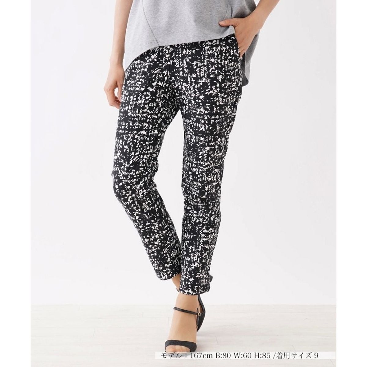 コーディネートのニュアンスアップにぴったりのモノトーンプリントをあしらったパンツ。美脚を演出するテーパードシルエットと、足元を軽やかに見せるクロップド丈のバランスが絶妙な1本です。