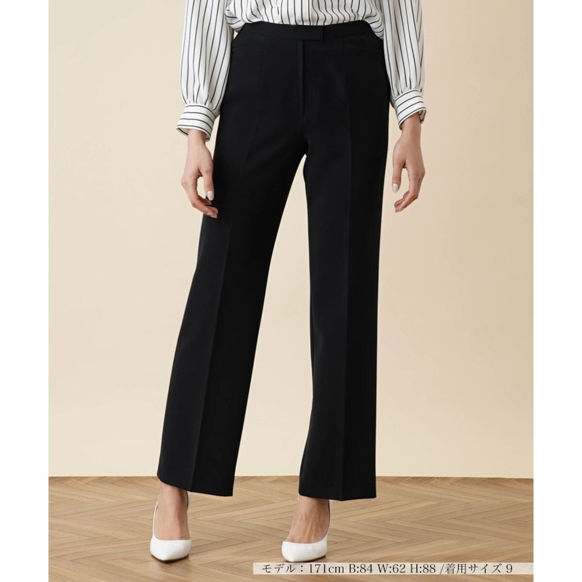 レッグラインを拾うことなくすっきりとスタイリングできるストレートシルエットで、知的スマートに決まるフルレングスパンツ。無地のベーシックカラーでデザインしているのでトップスを選ばずにコーディネートできます。ダーツを施し、伸縮性抜群のストレッチ素材で仕立てているから優しい穿き心地でどんな動きにもフィットしてくれます。