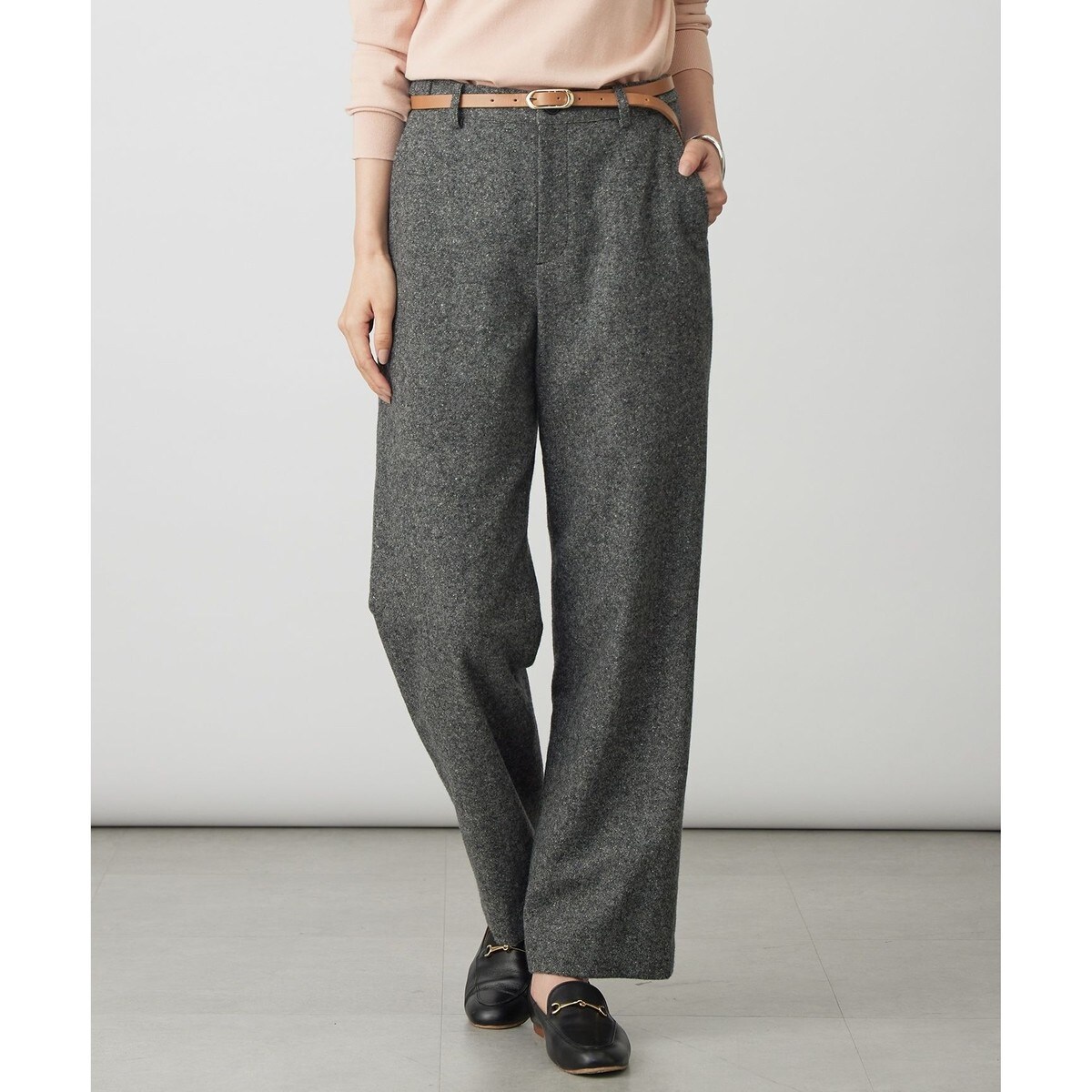 ■デザインどんなスタイルにも合わせやすい、ややゆとりを持たせたストレートパンツ。定番のシルエットとレングス感で、ヒールにかぶせても、フラットシューズでワンクッションさせてもきれいに決まる1着。ウエスト脇のタブ&釦ディテールでトラッド感を演出し、後ろウエストにはゴムを入れることで適度なホールド感と、快適な穿き心地を両立しています。温かみのある表情で、秋冬のスタイリングをぐっと引き立ててくれる万能アイテムです。総裏ありです。