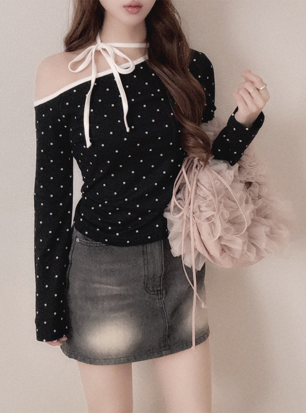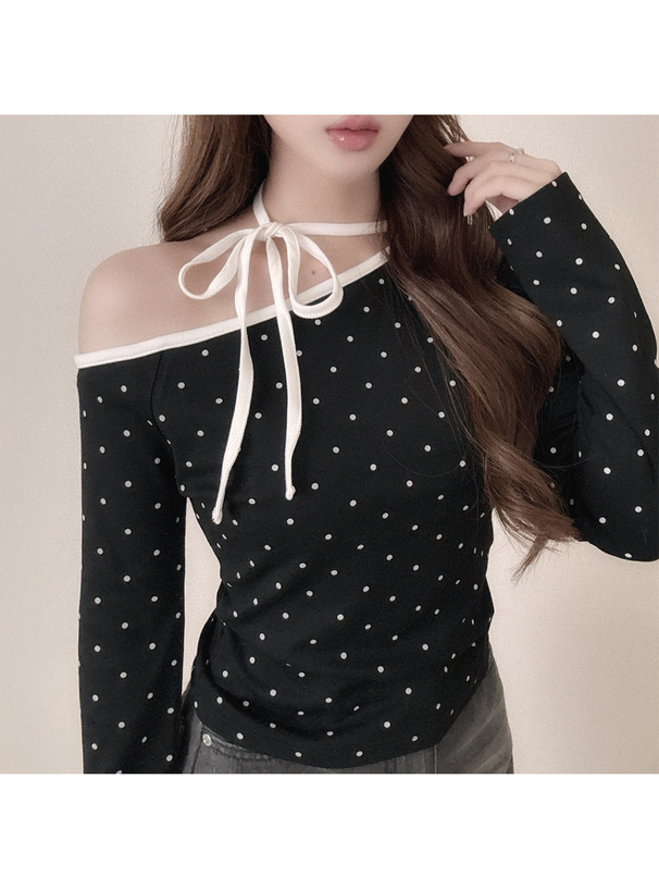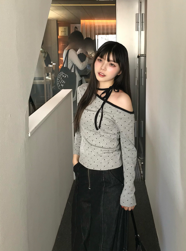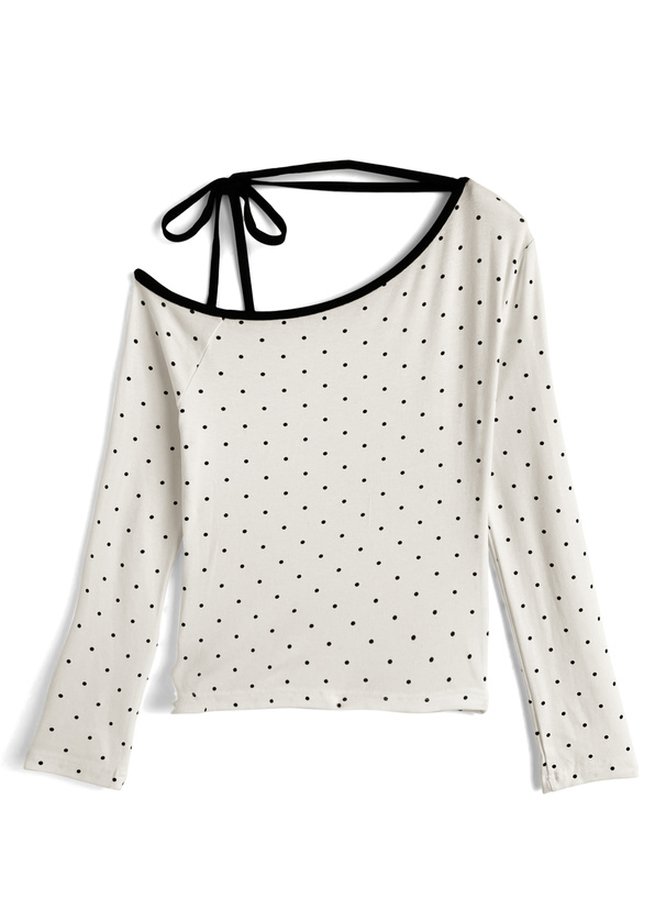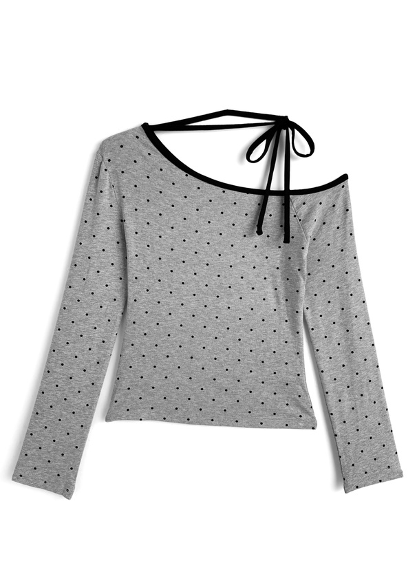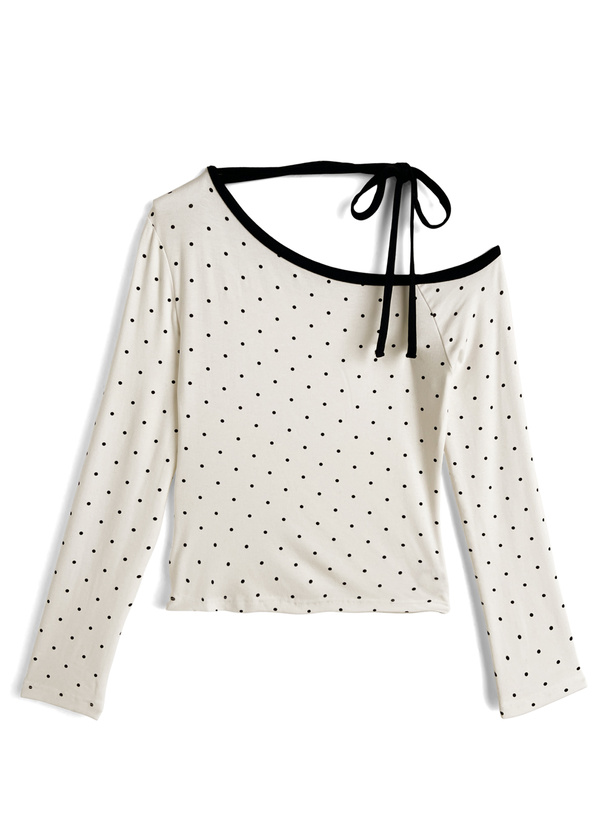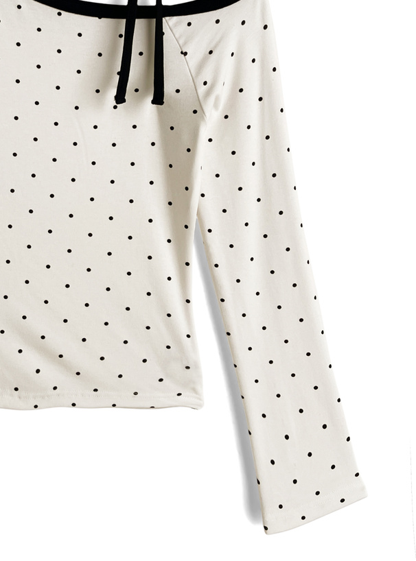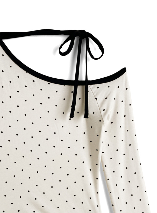 柔らかく伸縮性のあるカットソー生地に細かい水玉柄を散りばめたトップス。