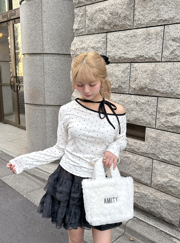 ワンショルダーとネックのリボンデザインがフェミニンな印象を与える。