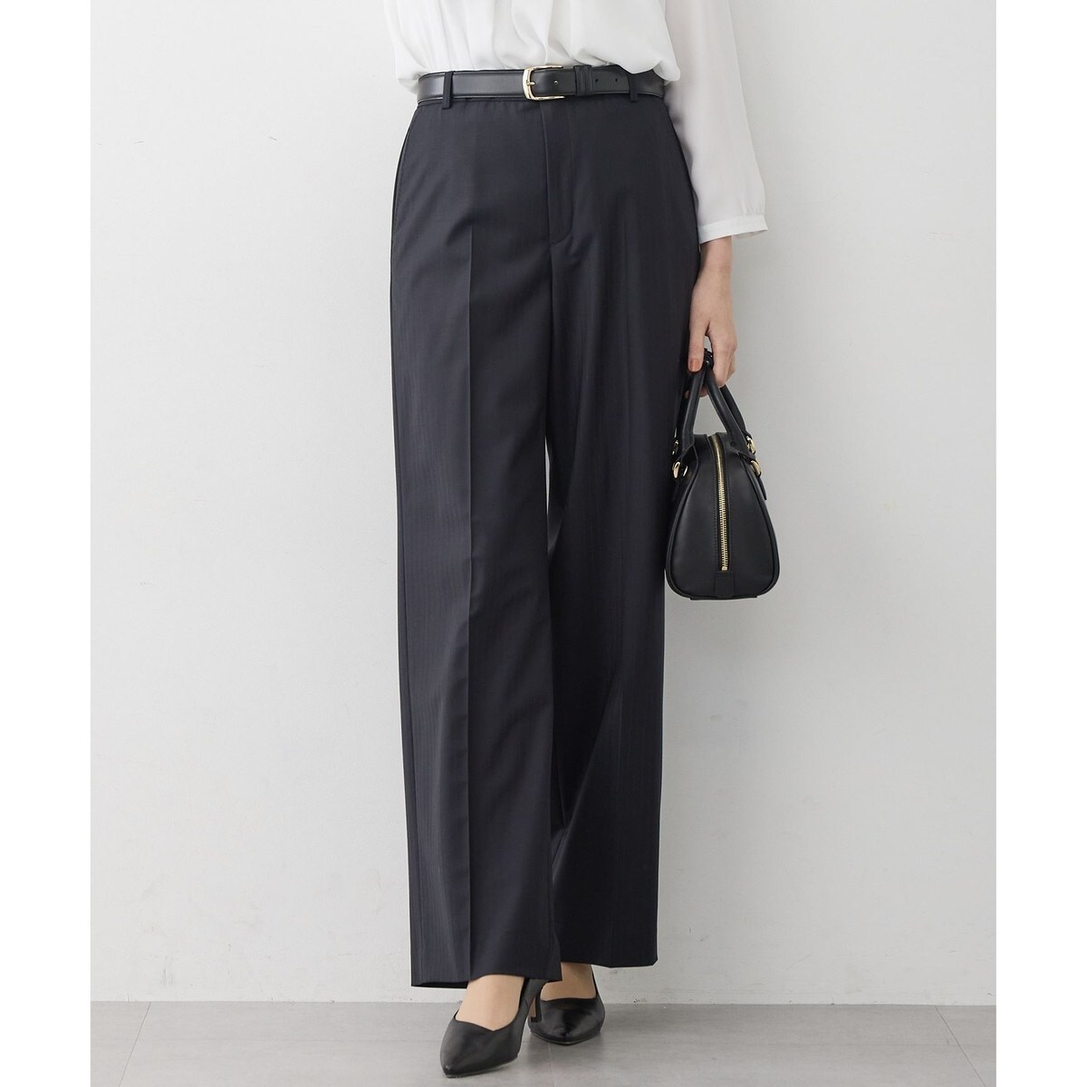 すっきりとしたワイド過ぎない上品なシルエットが特徴のパンツです。センタープレスが縦のラインを強調してくれます。裏地のない一枚仕立てのため、軽やかな穿き心地で、季節を問わず快適に着用いただけます。 同素材のジャケットと合わせれば、通勤やセレモニーシーンにふさわしい洗練されたセットアップスタイルが完成します。また、単品使いでもきれいめスタイルとして、デイリーにも活躍する一本です。カラーは、着回し力抜群のベーシックなブラック(#005)、濃紺寄りの深いネイビーストライプ(#175)、洗練された都会的な雰囲気を醸し出すグレー(#004)の3色展開です。