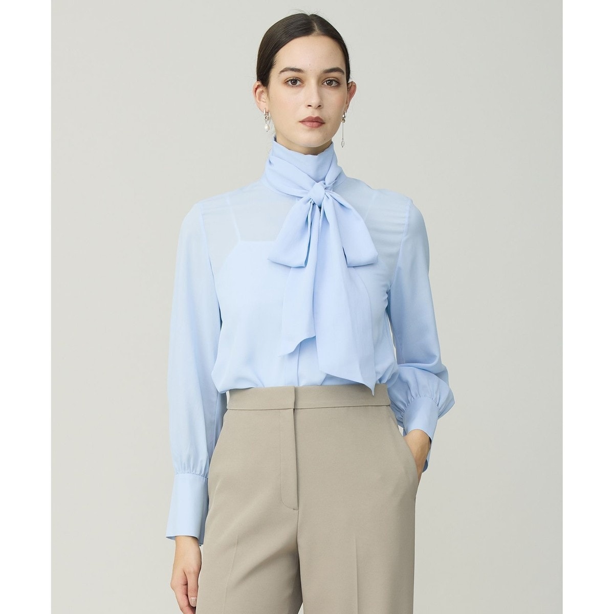 ■デザイン上品な光沢感のある素材できれい目な印象のボウタイ付きブラウスです。ボリューム感のある袖、長めカフスの三連ボタンが特徴です。一枚でも着映えますが、ジレやニットとのレイヤードにもおすすめです。セレモニーシーンやお仕事でジャケットINに着てもごわつかない様、シルク混の柔らかい素材を使用しています。