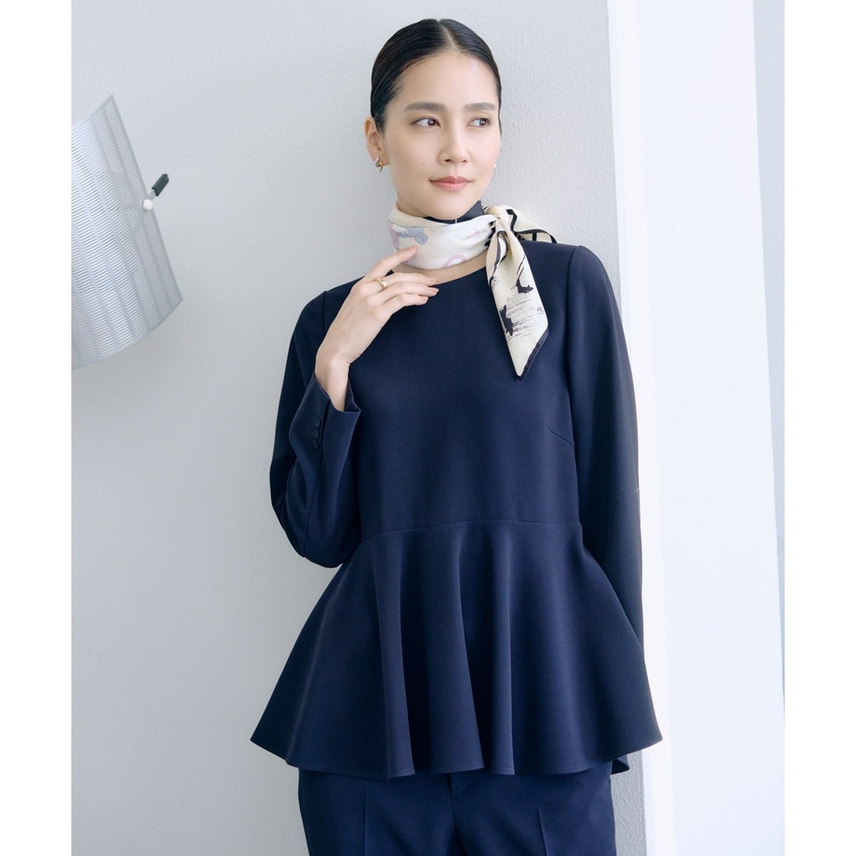 裾が広がったペプラムシルエットのコンパクトなブラウス。ウエストの切り替え部分はすっきり見えますが、生地にとろみがありやわらかいのでストレスなく着用できます。しっかりとした落ち感と揺れで甘くなり過ぎず、大人でも着用しやすいデザインブラウスです。