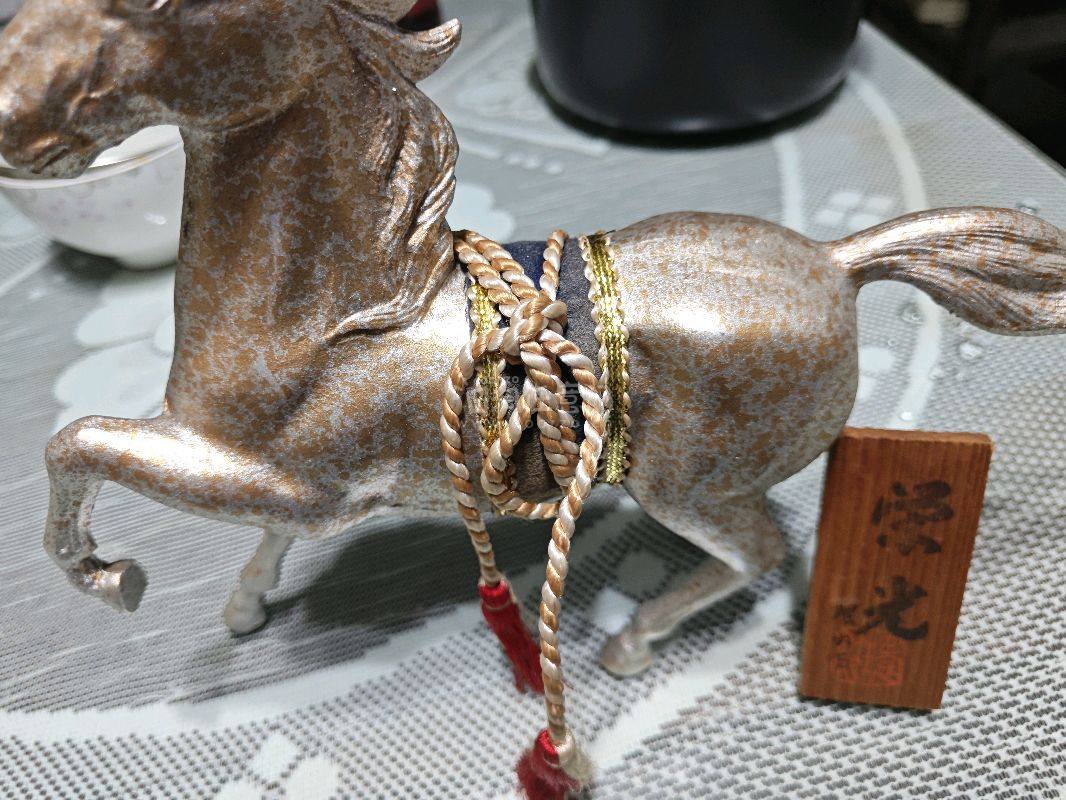 这日式骏马摆件工艺精巧,斑驳金白釉色显质感,绳饰流苏配“宗光”木牌,古雅韵味足,是雅致的装饰好物。虽然报关有些小插曲,不过还是过关了