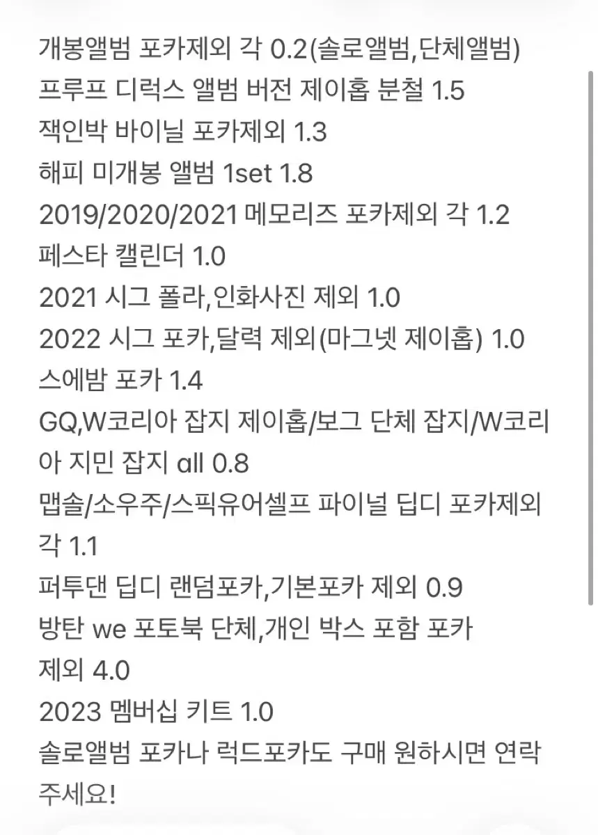 방탄소년단 굿즈 팔아요! 마지막 페이지에 굿즈 목록과 가격 있어요! 사용감이 다들 조금씩 있어요 (예민하신분🙅♀️) 상세사진은 연락 주시면 보여드려요 솔로 앨범 포카도 함께 판매 가능하니 연락주세요 쿨거시 에눌 가능해요 덤 많이 챙겨드려요 연락주세요! 🚚배송방법 일반택배,우체국택배만 가능해요! 💌소개글 읽고 연락 부탁드려요! 덤 많이 챙겨드려요 연락주시면 상세사진 보여드려요